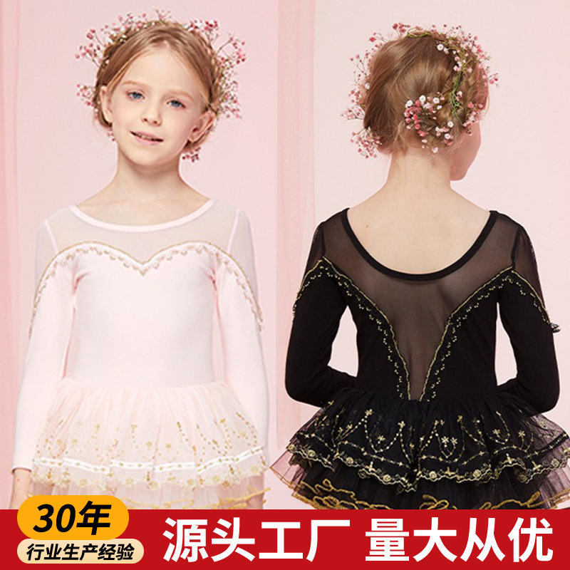 Pakaian dansa anak-anak, pakaian latihan musim gugur dan musim dingin rok menari lengan panjang baju dansa China rok performa pettiskirt balet