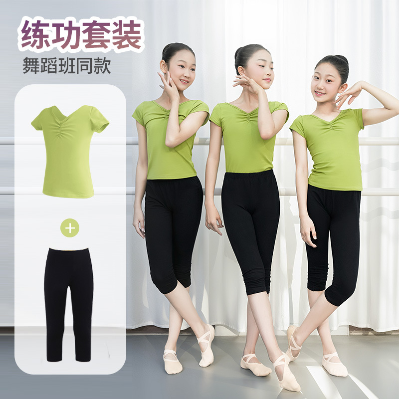 Pakaian Tari Anak-anak Model Baru Musim Panas Baju Atasan Lengan Pendek Warna Hijau Pakaian Latihan Celana Balet Anak Perempuan Celana Tujuh Perempat Set Tubuh