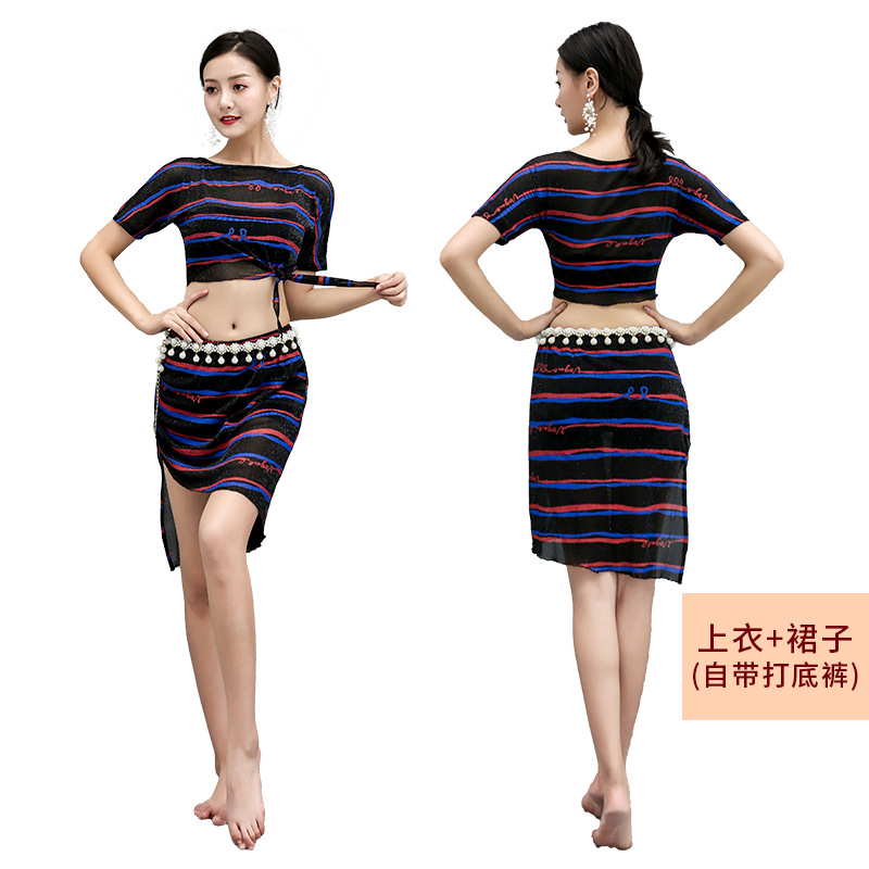 Baju dansa musim panas, baju latihan tari perut, baju latihan penampilan, baju jaring bermotif