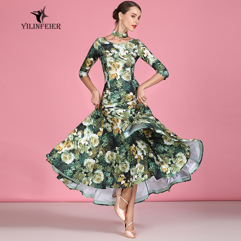 Rok Tari Modern Dewasa Baru Yilin Feier S9062 Gaun Pakaian Dansa Ballroom Cetak Rok Ayun Besar Lengan Panjang