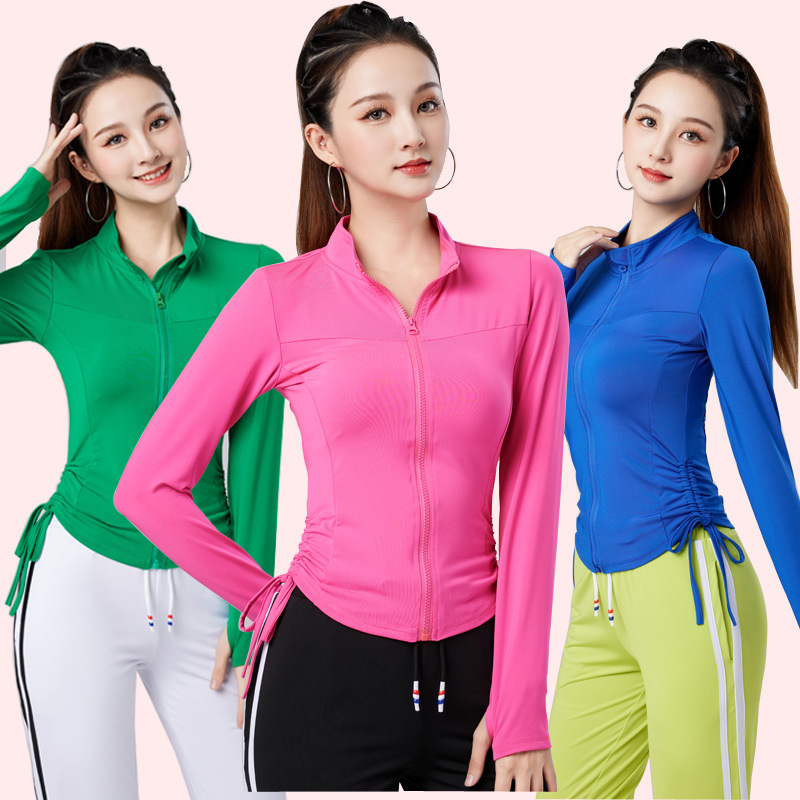 Kaus olahraga lengan panjang wanita, kardigan pakaian tari merah aerobik yoga lengan panjang