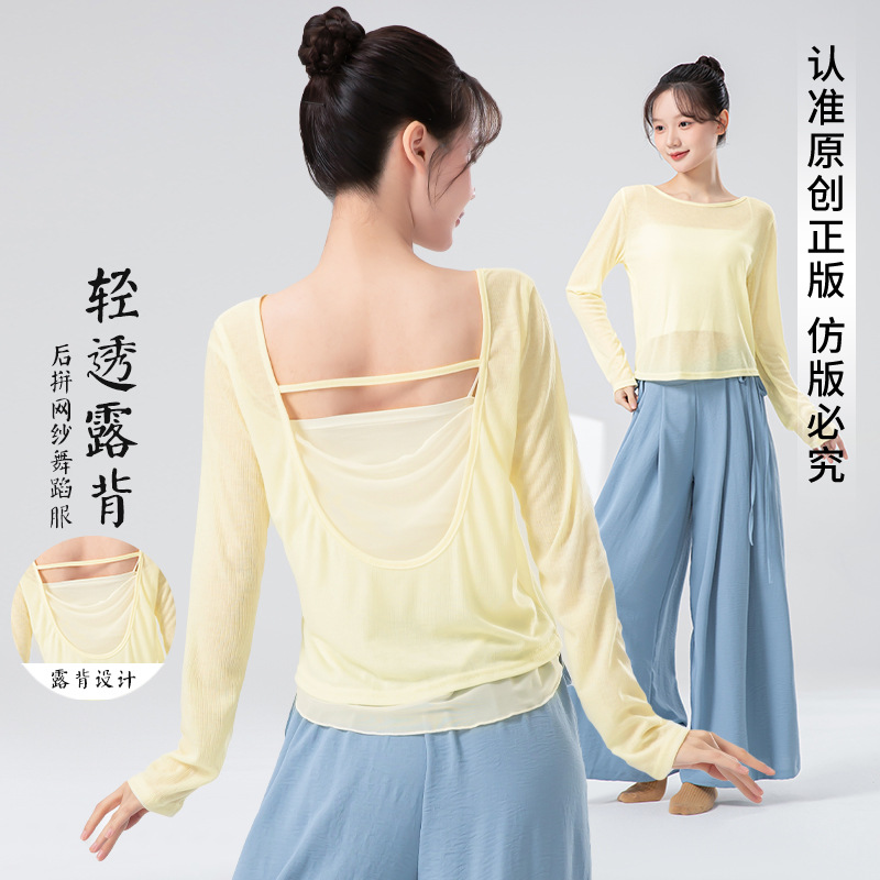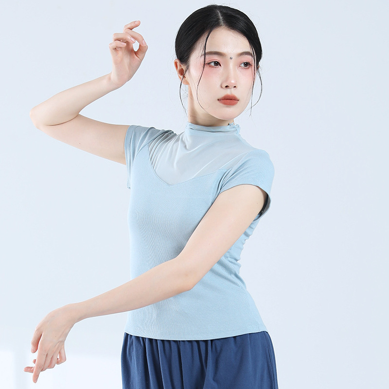 Pakaian latihan dansa modern top dewasa slim-fit lengan pendek musim panas mesh turtleneck pakaian dansa Etnik klasik Tiongkok untuk wanita