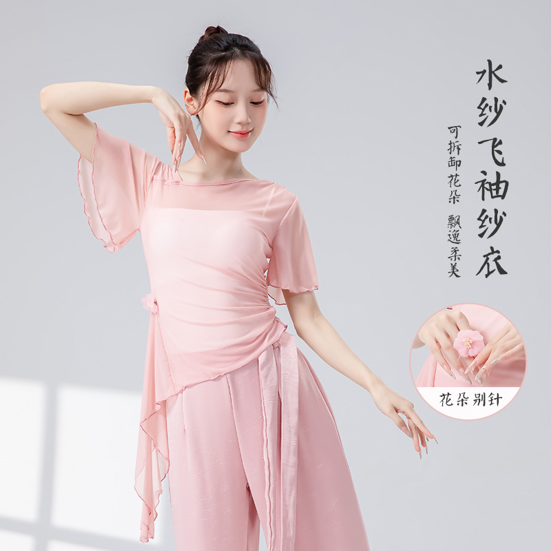 Pakaian Tari Klasik Atasan Bunga Kasa Lengan Pendek Slim Fit Model Baru Musim Panas Wanita Pakaian Latihan Pertunjukan Tari Eyang-elegan Modern