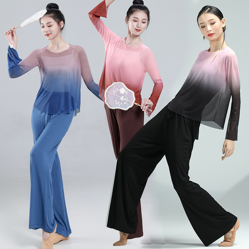 Kostum tari klasik wanita, pakaian kasa pesona badan wanita, atasan latihan seni warna gradien elegan