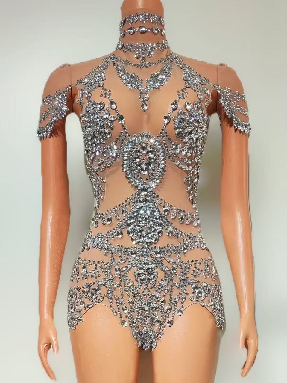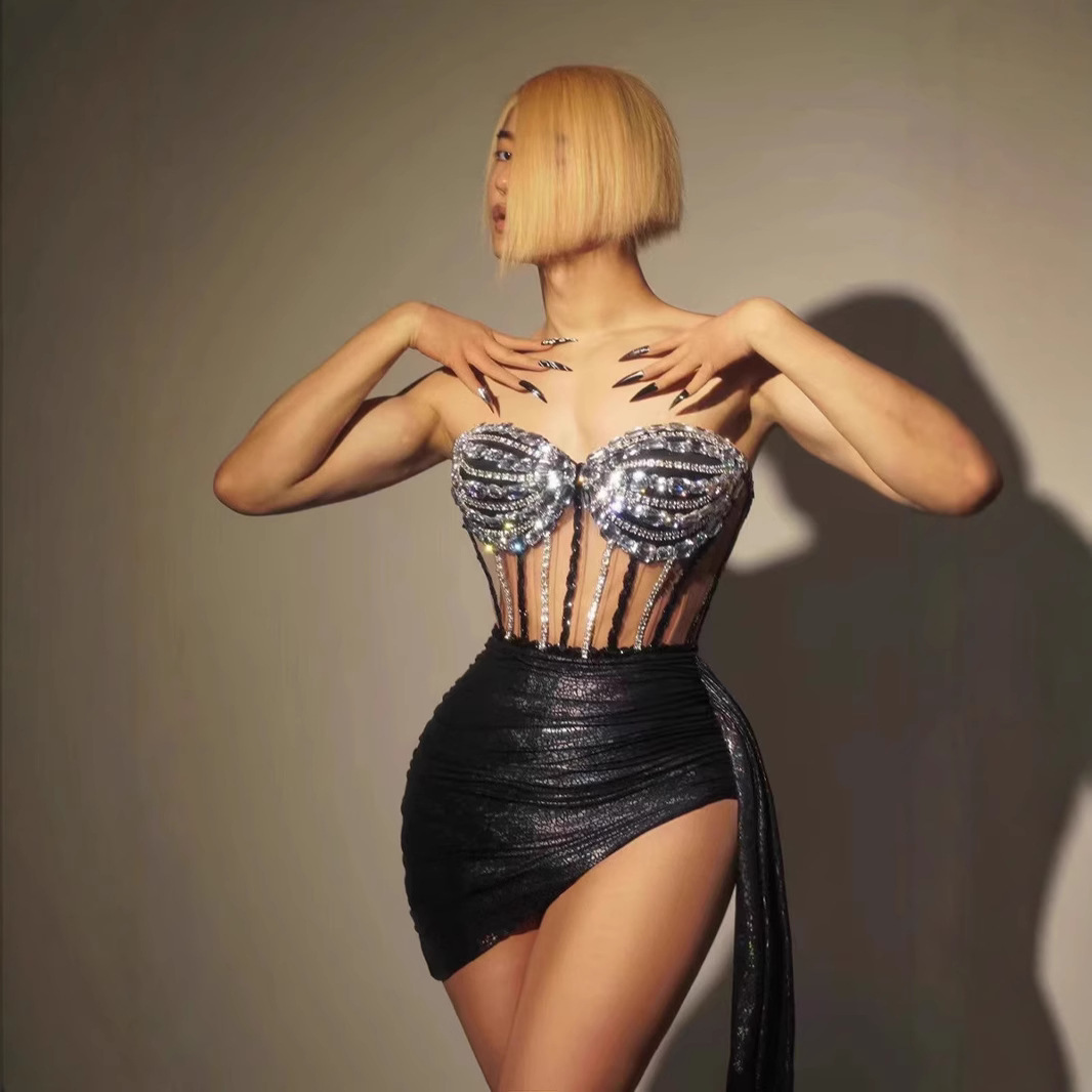 Kostum Kostum Pertunjukan Panggung Klub Malam Pakaian Ketat Kasa Seksi Berlian Penuh