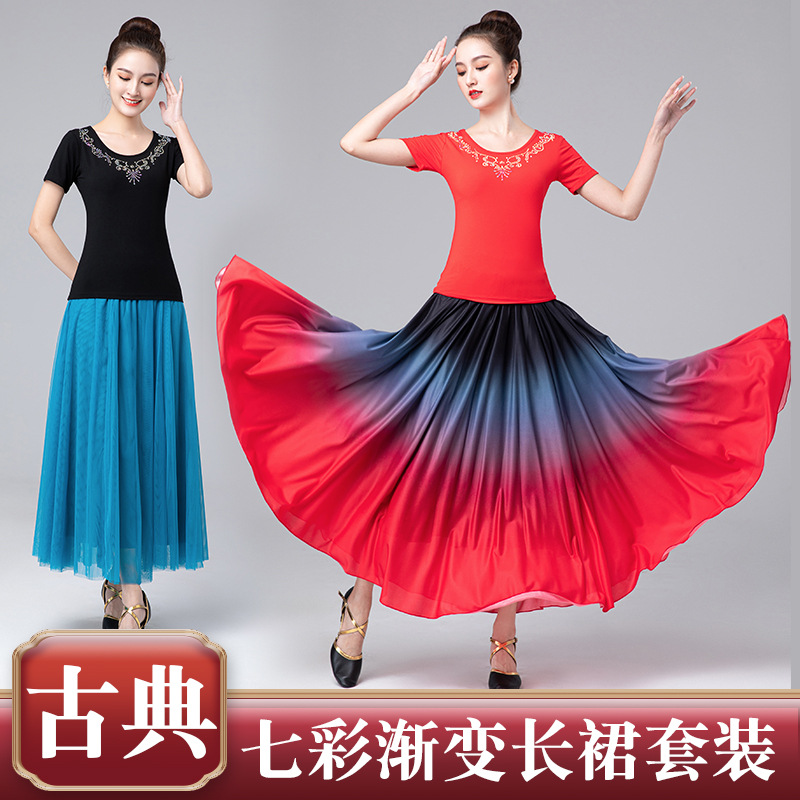Fengti baru pakaian dansa persegi modal berlian tertanam pakaian tari etnik warna-warni gradien besar gaun ayun kelompok pakaian kinerja