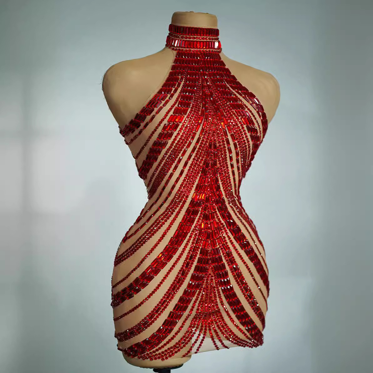 Nuofens gaun model halter wanita, pakaian penampilan baru 2024 rok pendek anggur merah berlian penuh, bar klub malam
