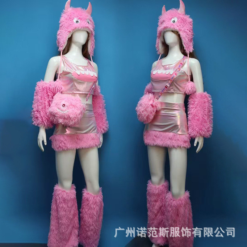 Gaun Set Monster Kecil Merah Muda Berbulu Model Baru Gaun Pendek Foto Studio Ulang Tahun Pakaian Lagu Panggung Grup Wanita