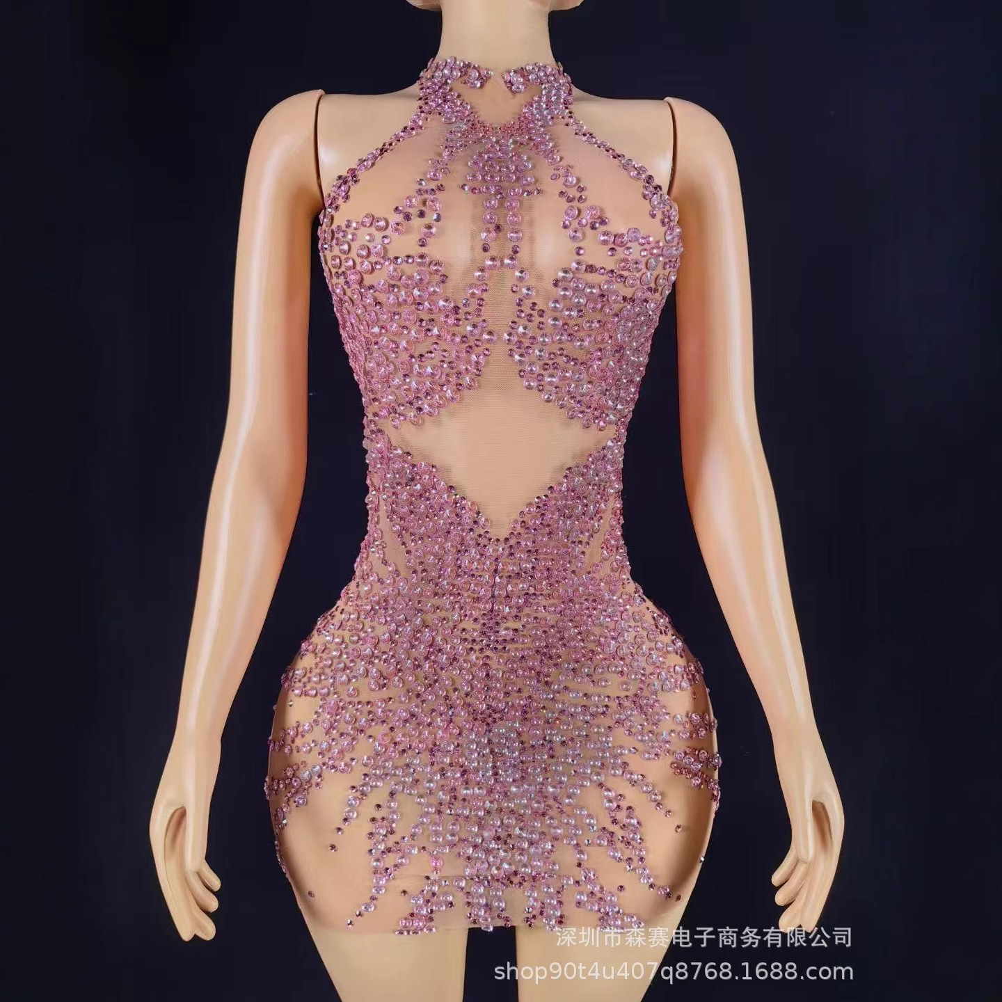 Gaun Pinggul Gantung Leher Seksi Berlian Imitasi Merah Mawar Berkilau Model Baru Pakaian Panggung Disko Klub Malam Pakaian Pertunjukan Penyanyi Musik