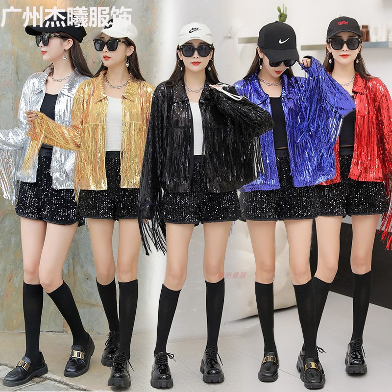 Mantel pendek berpayet gaya Korea lengan panjang modis rumbai desain atasan longgar untuk pakaian pertunjukan tari klub malam bar
