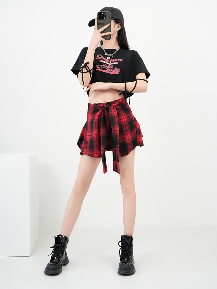 Kostum dansa jazz wanita, pakaian pertunjukan jazz dansa pusar terlihat, rok kotak-kotak setelan aktivitas musim panas