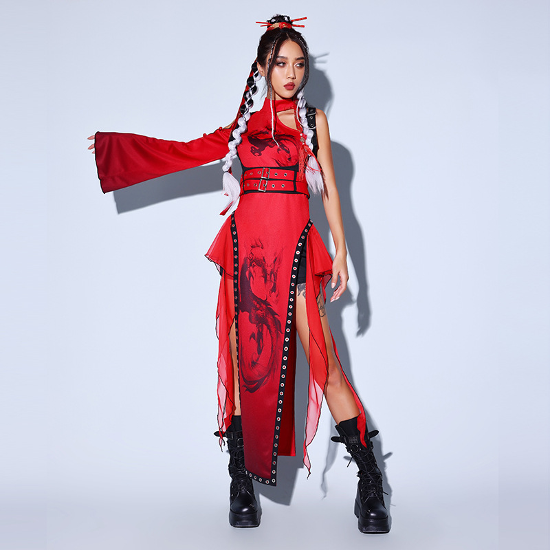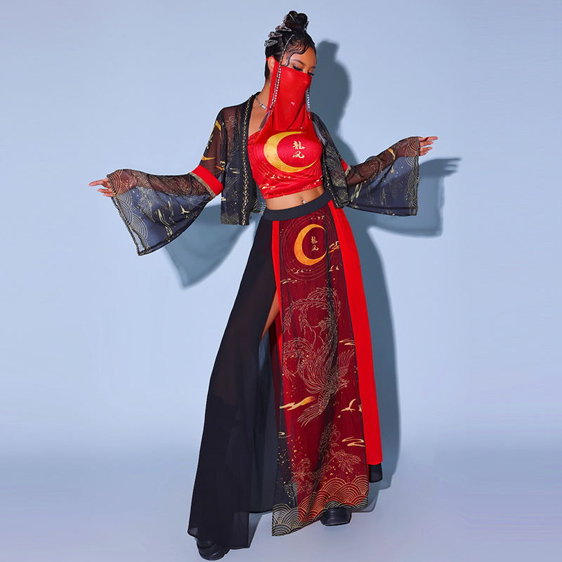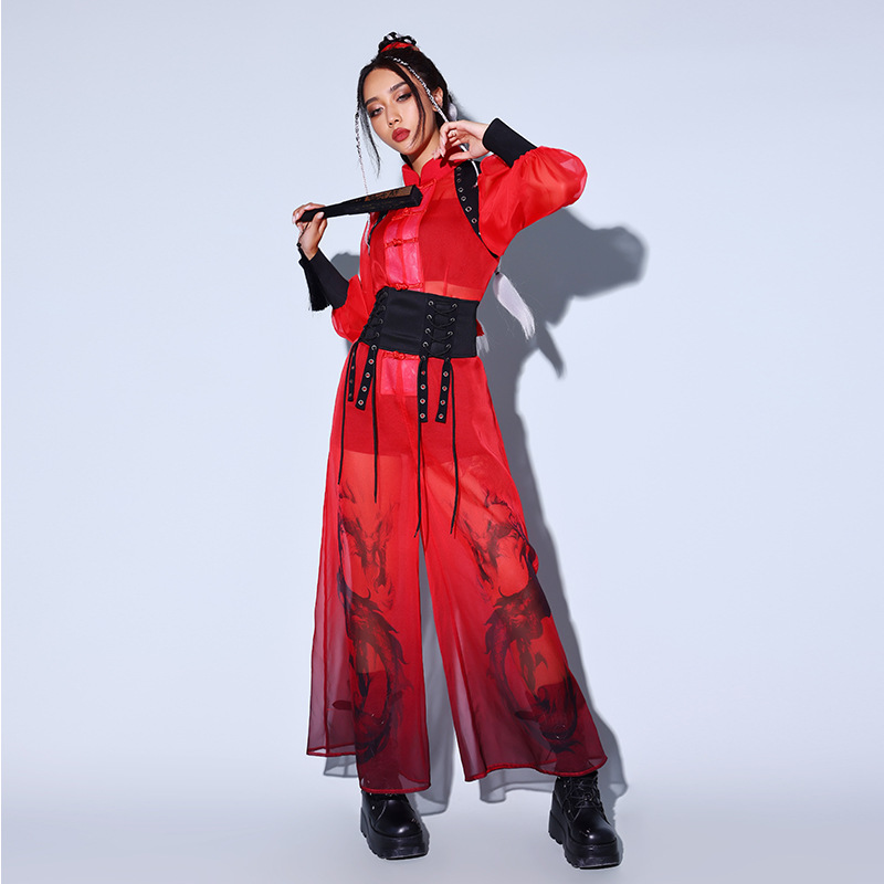 Kostum dansa jazz gaya Tiongkok, kostum pertunjukan Festival, kostum dansa merah, Kostum grup lagu, kostum dansa nasional mode Cina