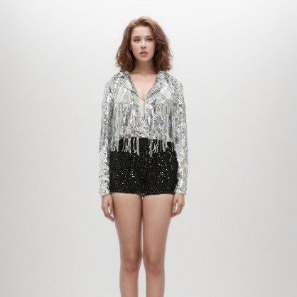 Jaket kardigan berpayet untuk wanita, pakaian pertunjukan kelompok wanita, mantel kardigan berpayet rumbai bergaya Eropa dan Amerika untuk wanita