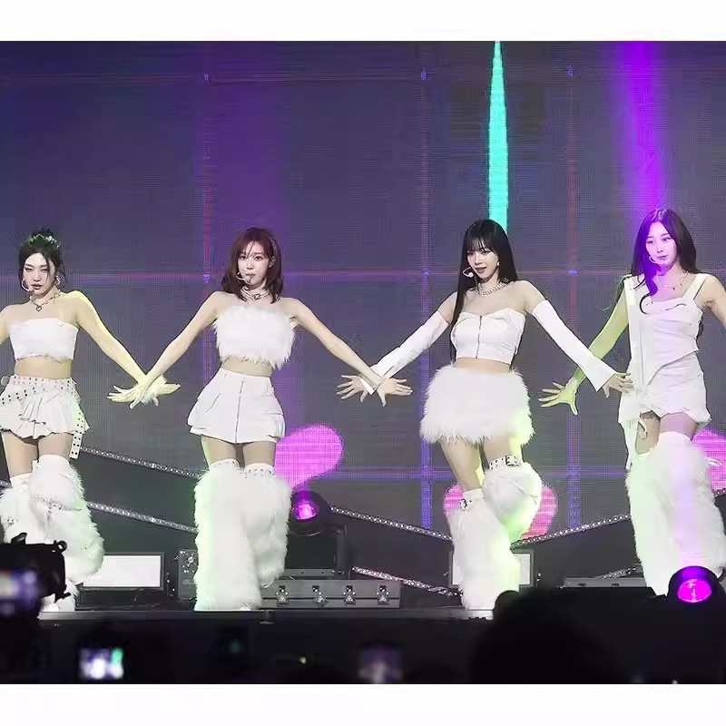 Kostum panggung gaya sama grup perempuan Korea Aespa, setelan bulu untuk penampilan panggung wanita