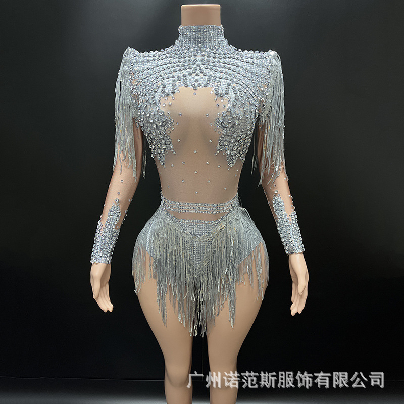 Pakaian Dansa Latin dengan Rumbai Berlian Imitasi Warna Perak Seksi Eropa Amerika