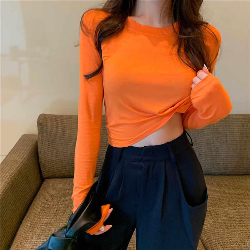 Atasan dansa jazz wanita, pakaian lengan panjang oranye terang gaya Grup kaus warna permen jazz pendek perspektif mikro tipis
