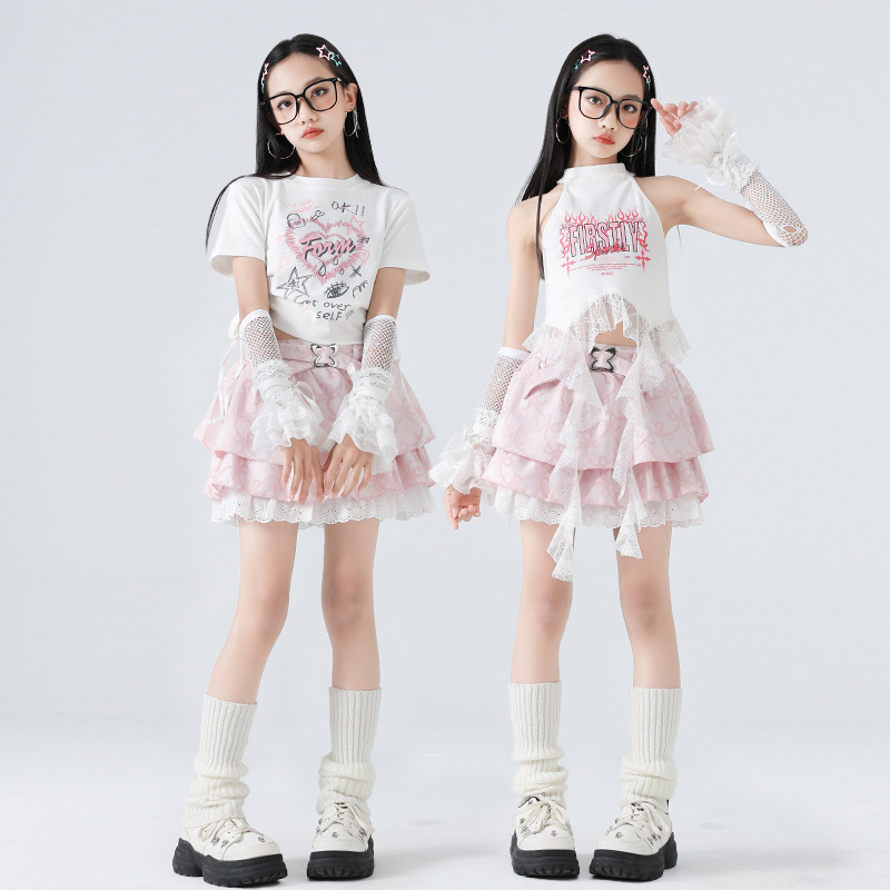 Kostum Tari Jazz Anak Perempuan Model Baru 2025 Rok Pendek Gaya Kelompok Wanita Manis dan Keren Musim Panas Anak Perempuan Pakaian Jazz