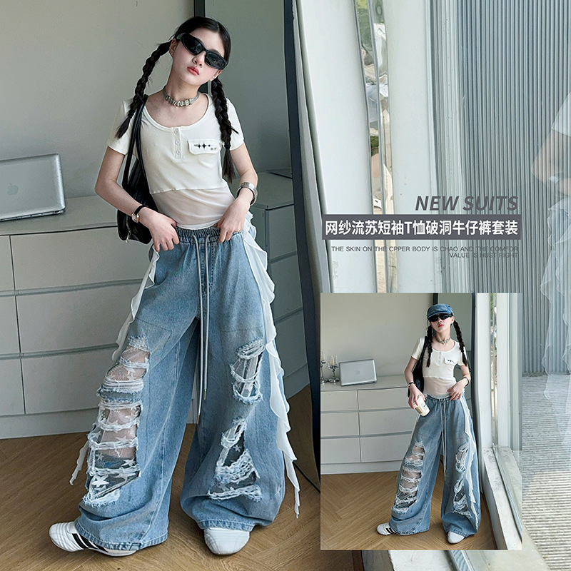 Setelan Pakaian Trendi Hip-hop Anak Perempuan Hiphop Pertunjukan Jeans Berlubang