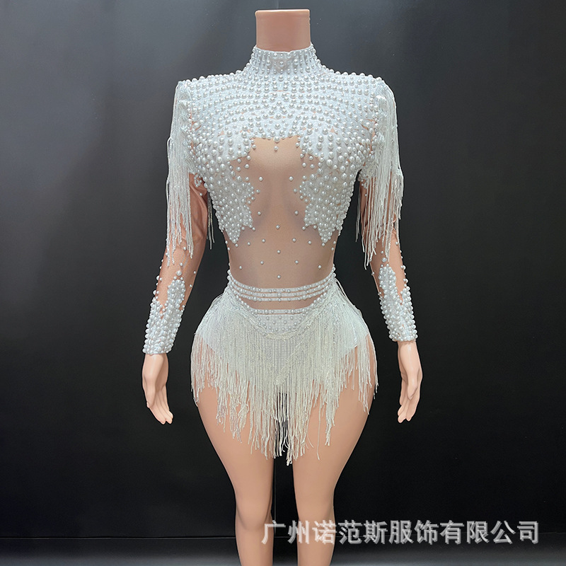Jumpsuit Membentuk Tubuh Garpu Rumbai Bersinar Model Baru Pakaian Tari Latin Daging Palsu Seksi