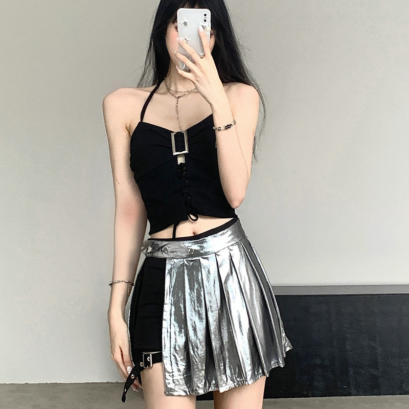 Pakaian musim panas untuk wanita: setelan dua potong rok celana perak yang sangat seksi dan tidak beraturan, pakaian pertunjukan panggung untuk grup cewek keren, modis.