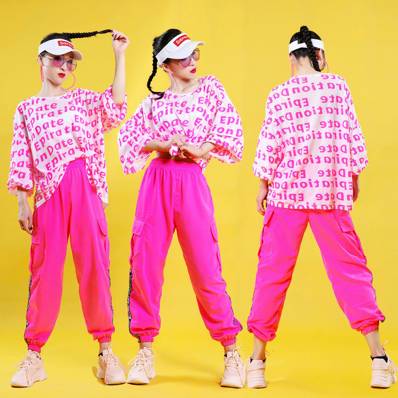 Kaos aerobik olahraga longgar dengan huruf fluoresen untuk wanita, seragam tim tari persegi, kostum pertunjukan tari grup gadis jazz.