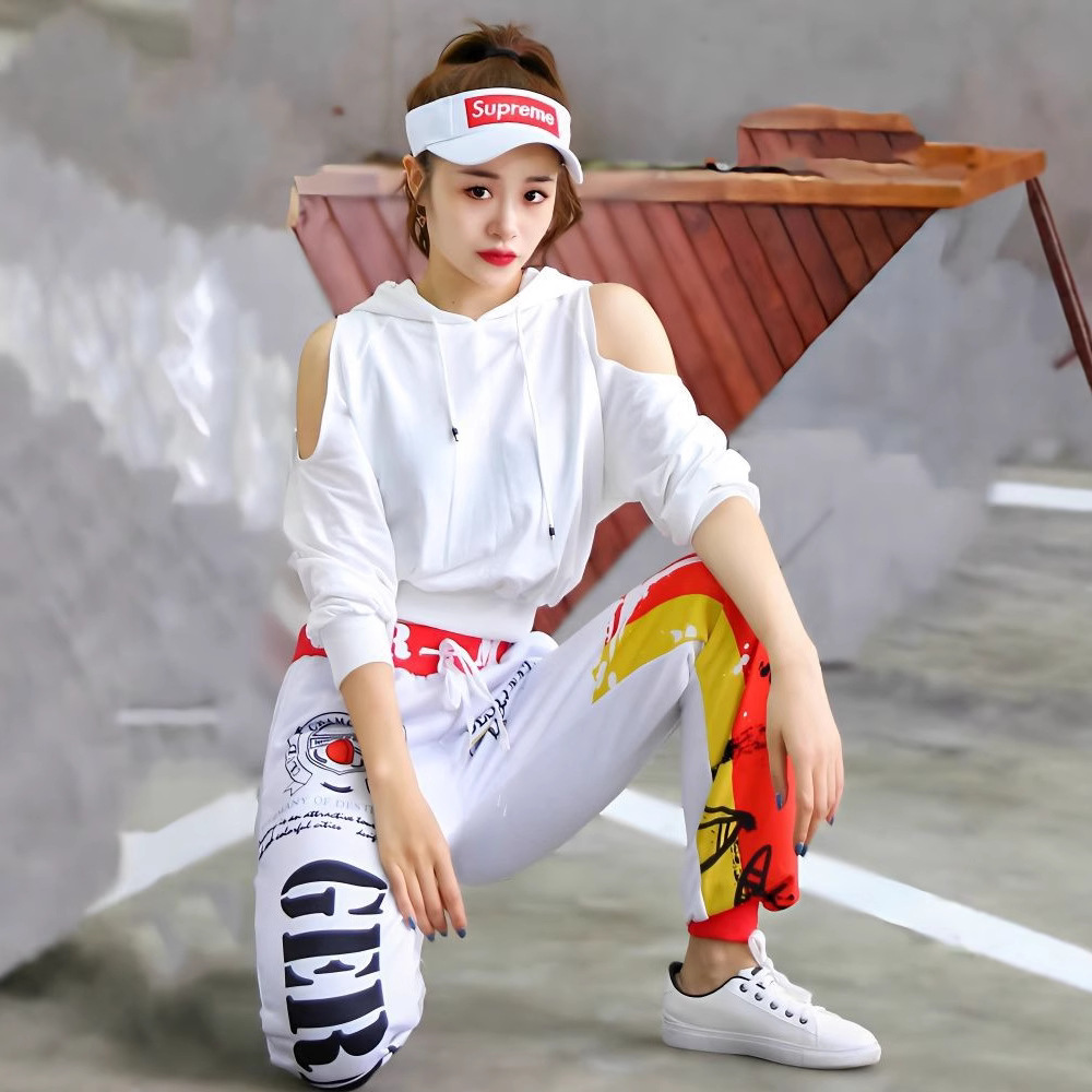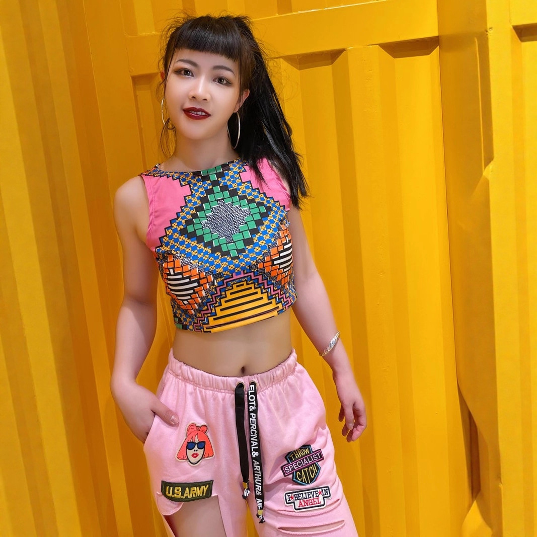 Celana pendek motif warna jahitan kepribadian lengan bahu gaya hip hop jalanan gaya Eropa dan Amerika setelan tari Jazz wanita