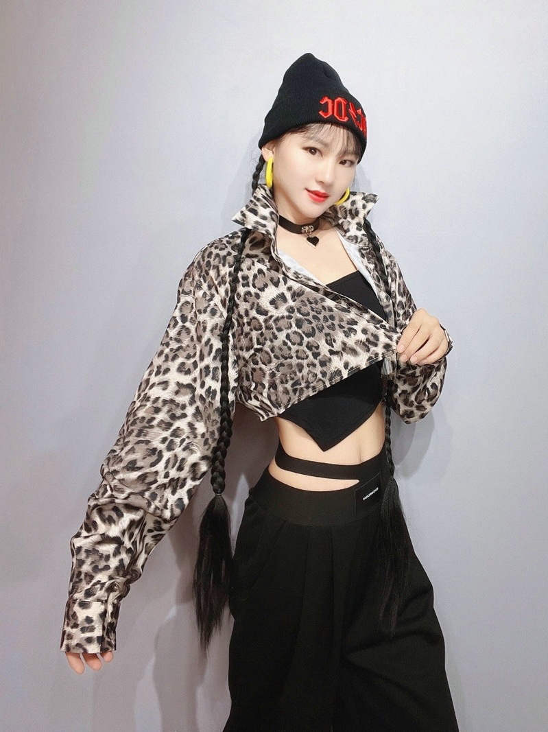 Pakaian dansa jazz jazz Atasan Wanita motif macan tutul, kardigan terlihat pusar, pakaian dansa modis Grup wanita pakaian latihan celana