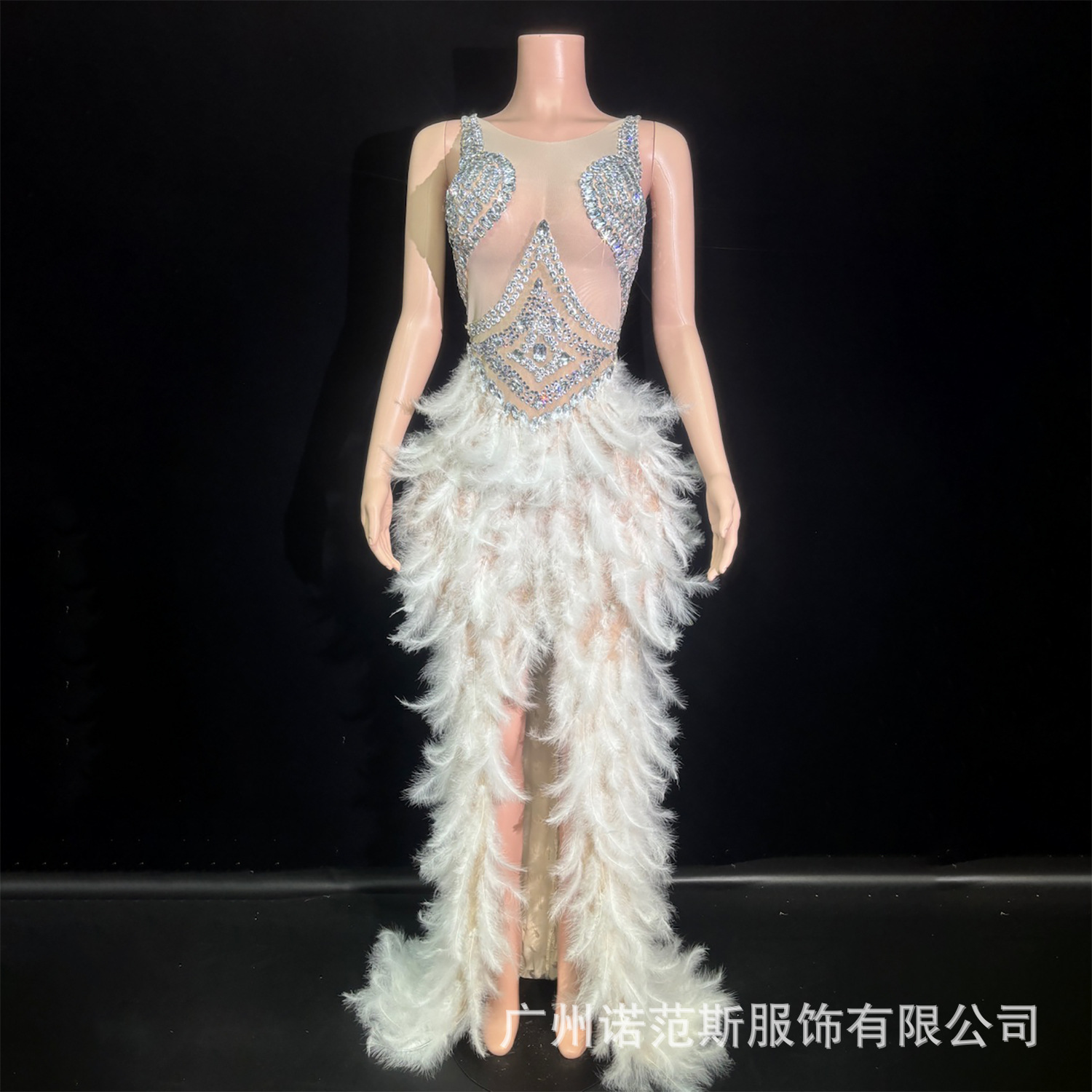 Rok Panjang Bulu Pinggang Pinggang Elegan Angsa Putih Berkualitas Tinggi Gaun Wanita Model Ledakan Tok Tok Gaun Pesta Pesta Malam