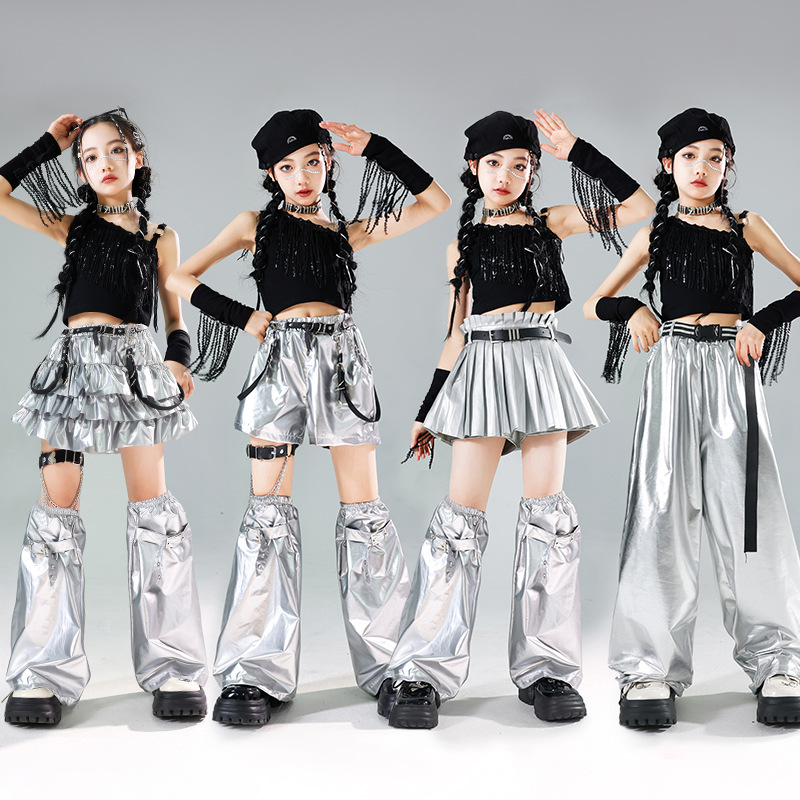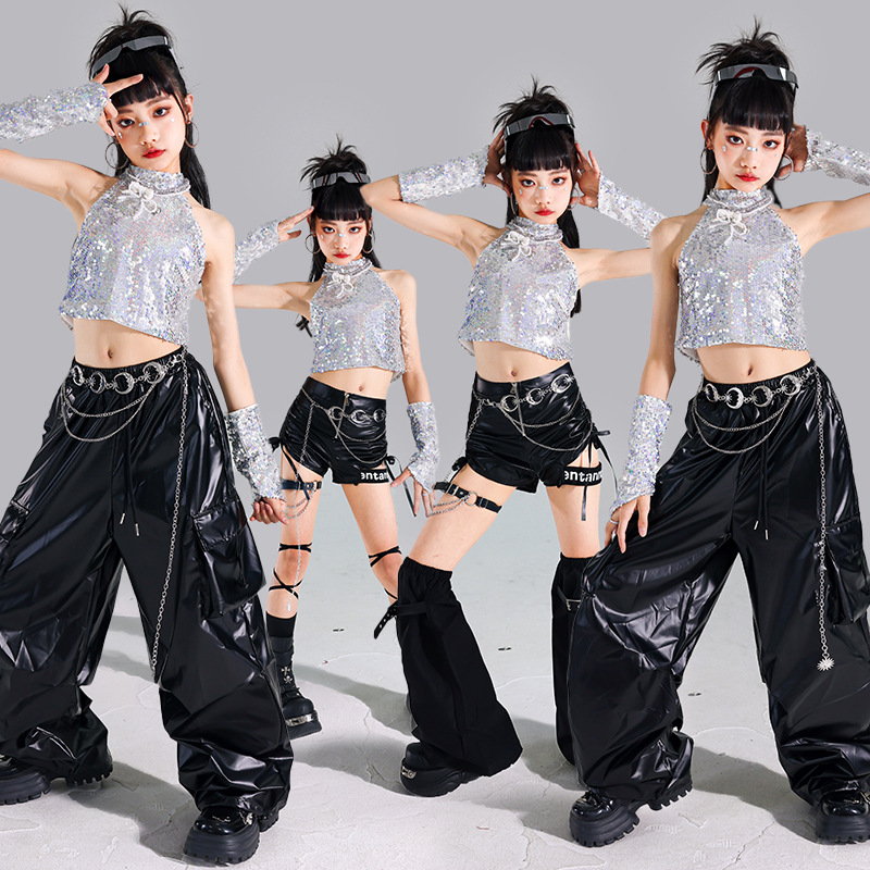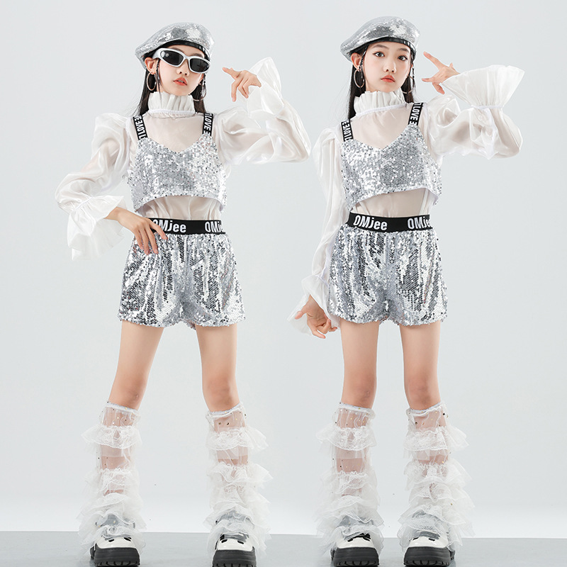 Pakaian Pertunjukan Tari Jazz Jazz Anak Perempuan Setelan Pertunjukan Payet Kulit Perak Kelompok Wanita Pakaian Tari Jalanan Anak Perempuan Pakaian Trendi