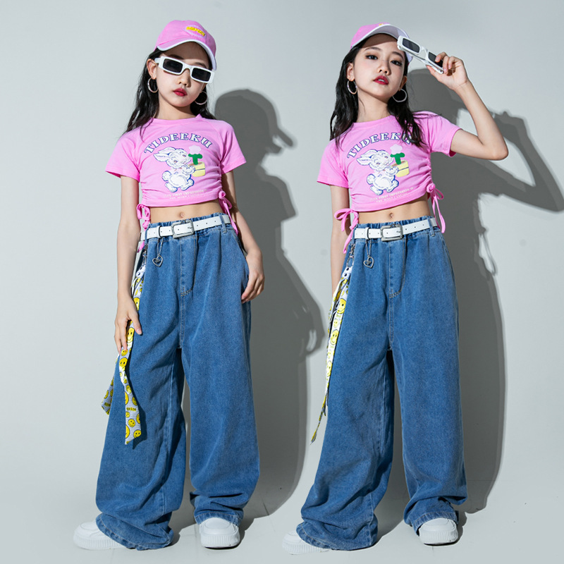 Pakaian pentas hip hop anak perempuan, pakaian pertunjukan hip hop wanita keren tampan, segel pinggang Denim, pakaian penampilan jazz dansa wanita