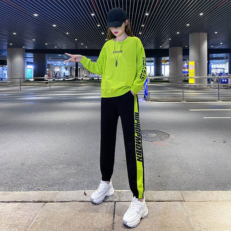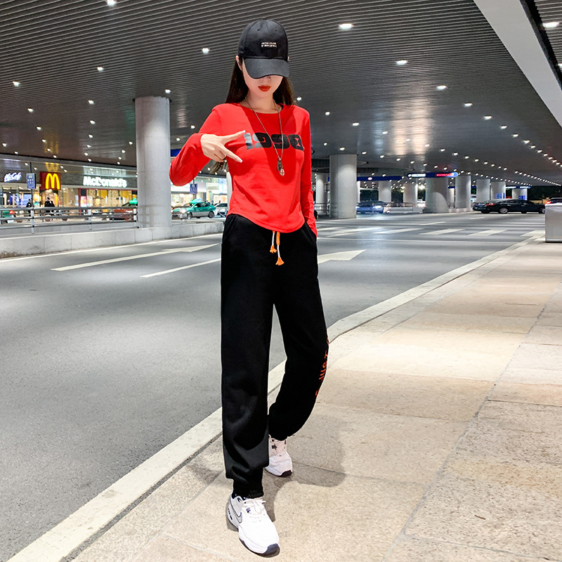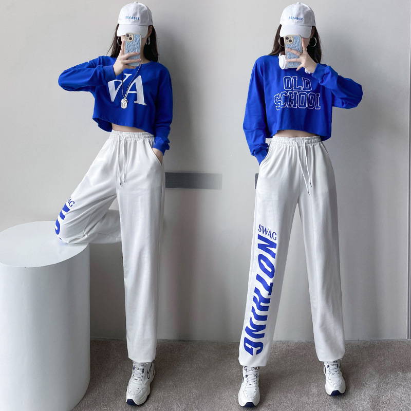 Musim gugur 2023 wanita leher bulat huruf dicetak lengan panjang celana kasual olahraga hantu berjalan tari persegi setelan dua potong