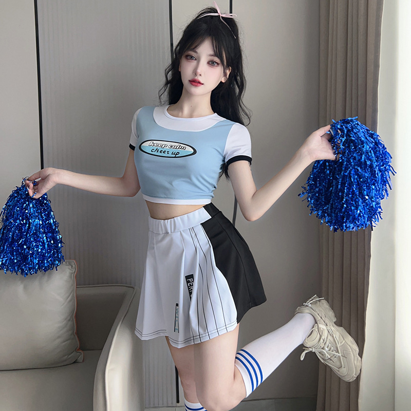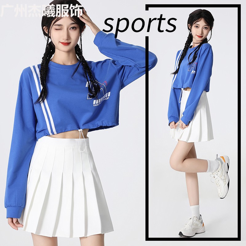 Harga shot nyata! Rok berlipat pinggang tinggi, setelan sweter pendek huruf biru, lengan panjang, rok lipit