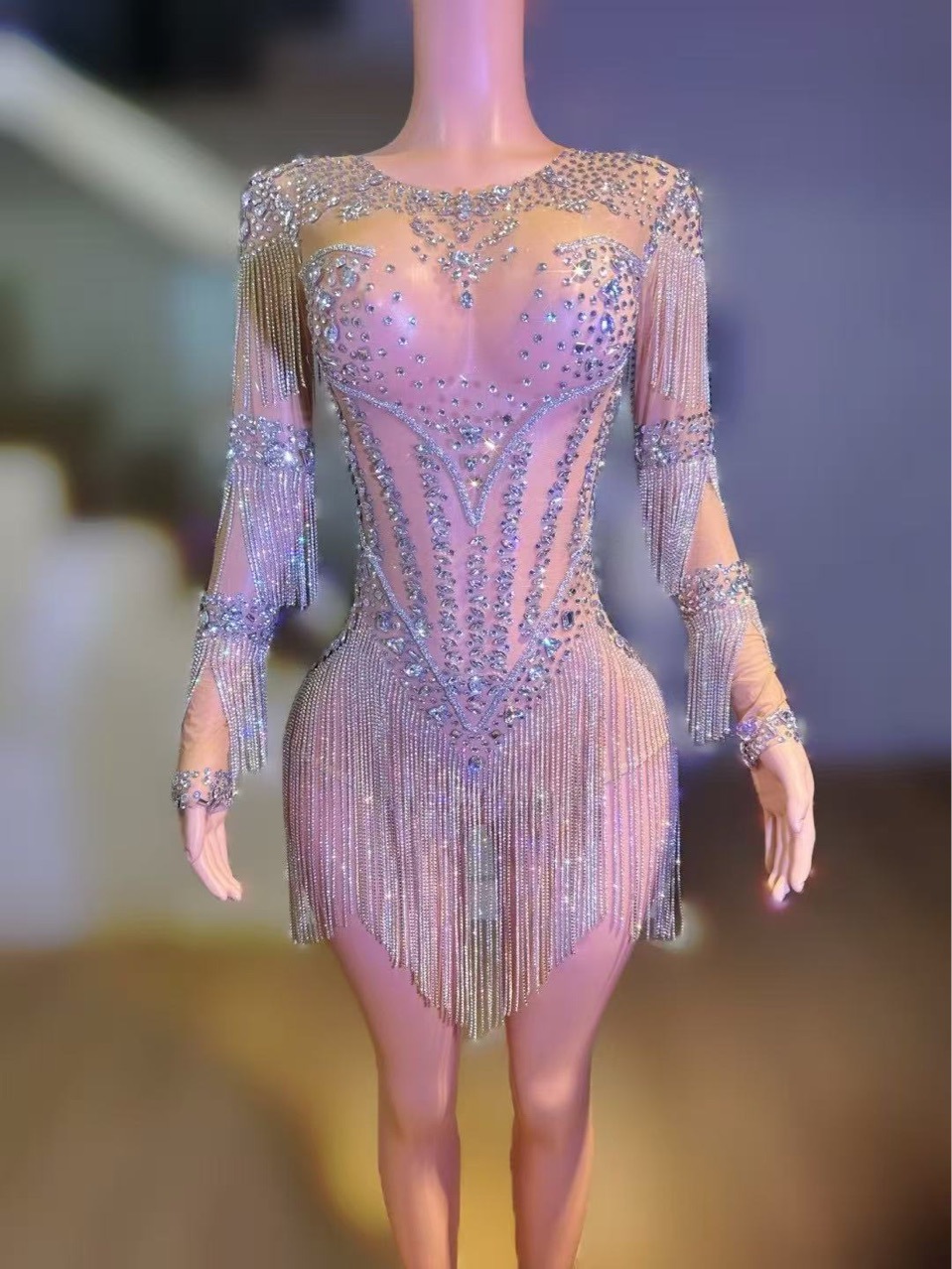 Gaun Pendek Elegan Warna Nude Perak Seksi Berlian Imitasi Kelas Atas Model Baru Pakaian Tari Latin Rumbai