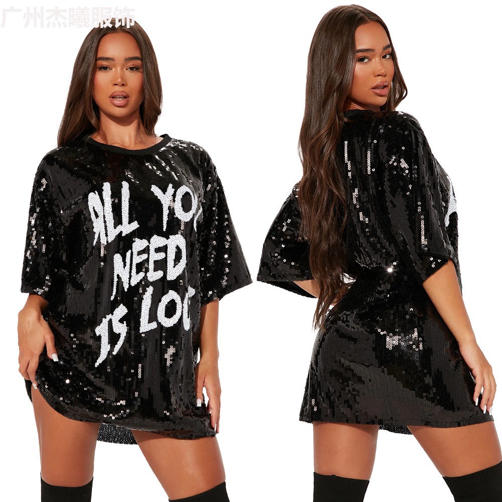 Pakaian gaya Eropa dan Amerika, kaus gaya klub malam berpayet longgar Lengan setengah leher bulat mode Eropa dan Amerika
