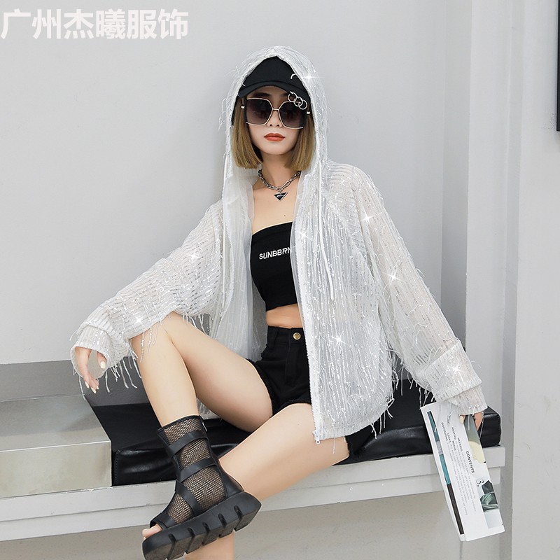 Jaket khusus wanita tabir surya lengan panjang payet rumbai rasa desain Senior Musim Panas 2023 baru