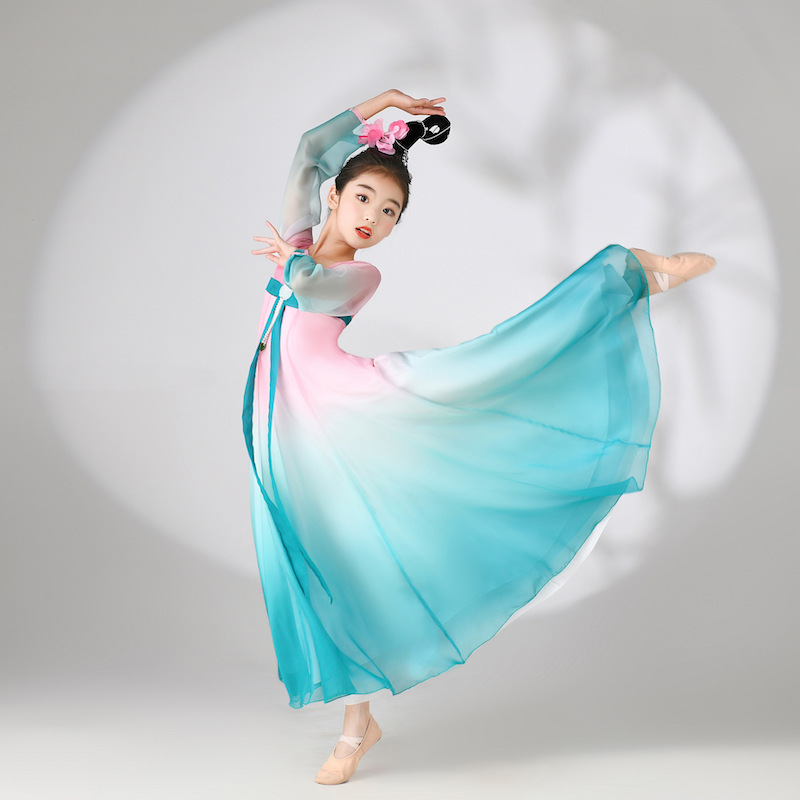 Pakaian dansa klasik, pakaian latihan anak-anak, pakaian kain kasa elegan Han Tang, gaya Cina, kostum penampilan Han