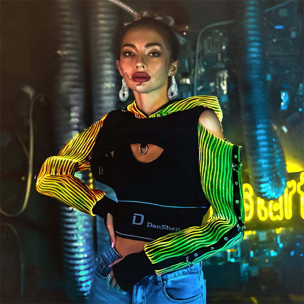 Cyberpunk hoodie wanita, pakaian atasan bercahaya tali pendek gelap serat optik performa Kelab Malam