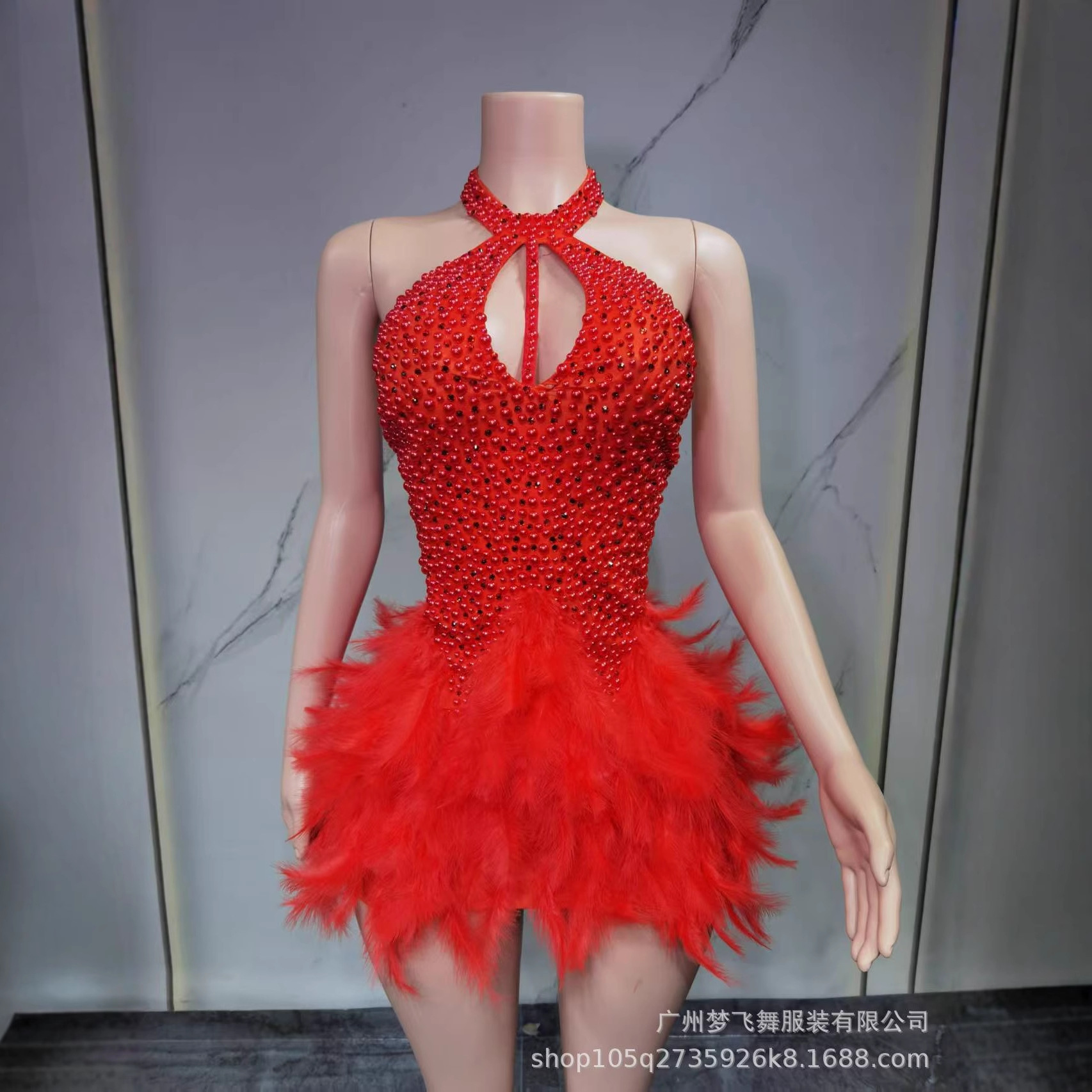 跨境欧美演出服珍珠羽毛夜店DJ歌手舞台表演性感舞台表演连衣裙