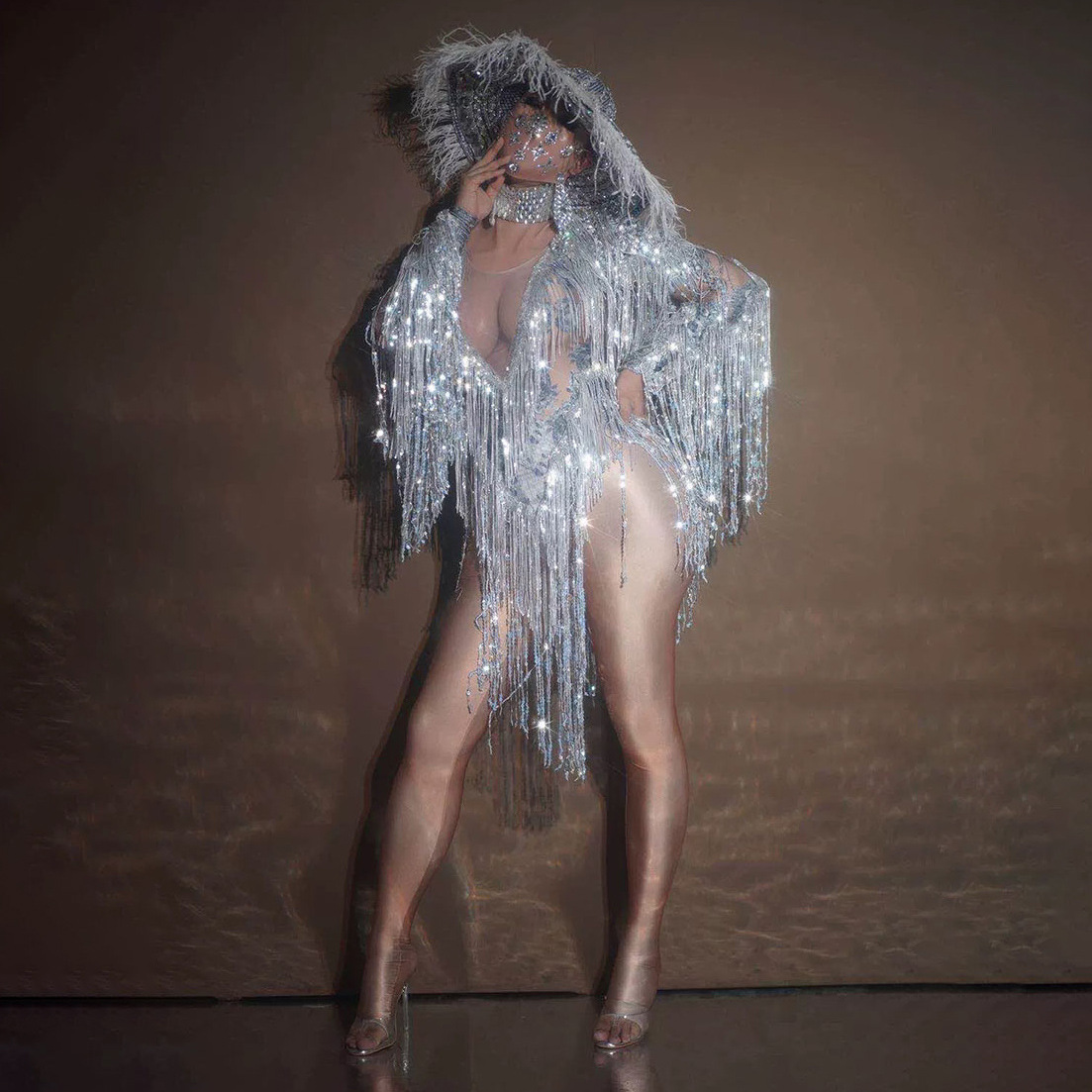 NOCANCE kostum penampilan dewasa wanita, kostum pertunjukan dewasa, rumbai berlian imitasi satu potong, mode bar penampilan panggung DJ, penyanyi wanita