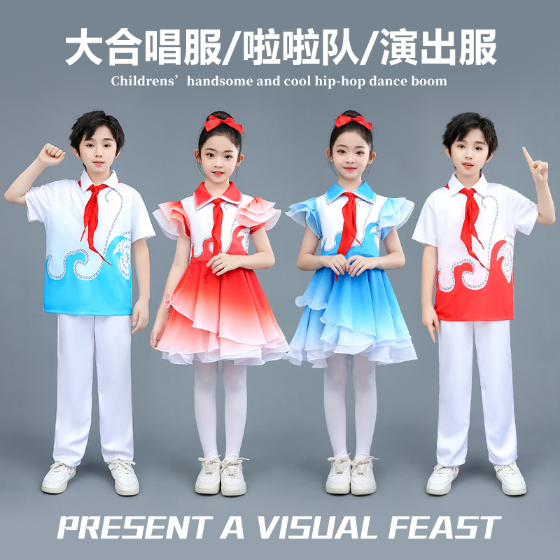 Pakaian Tentara Merah Kecil kostum penampilan anak-anak kostum pertunjukan Tentara Rute perlengapan pelindung merah pria dan wanita baru Keempat Tentara bintang merah bersinar kostum pertunjukan seragam militer