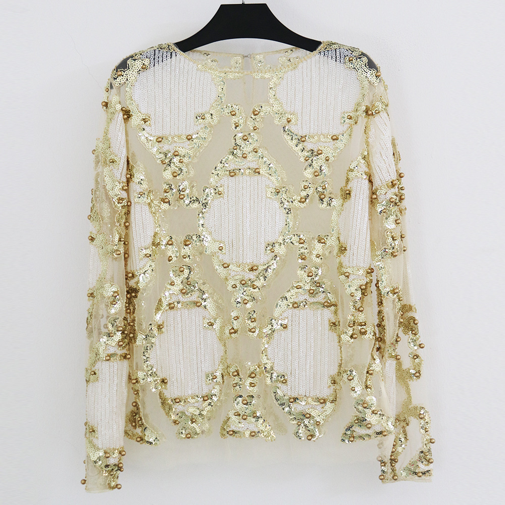 Atasan mewah ringan lengan panjang, pakaian atasan pertunjukan, baju dansa berpayet, jaring, pakaian penampilan dansa, atasan mewah