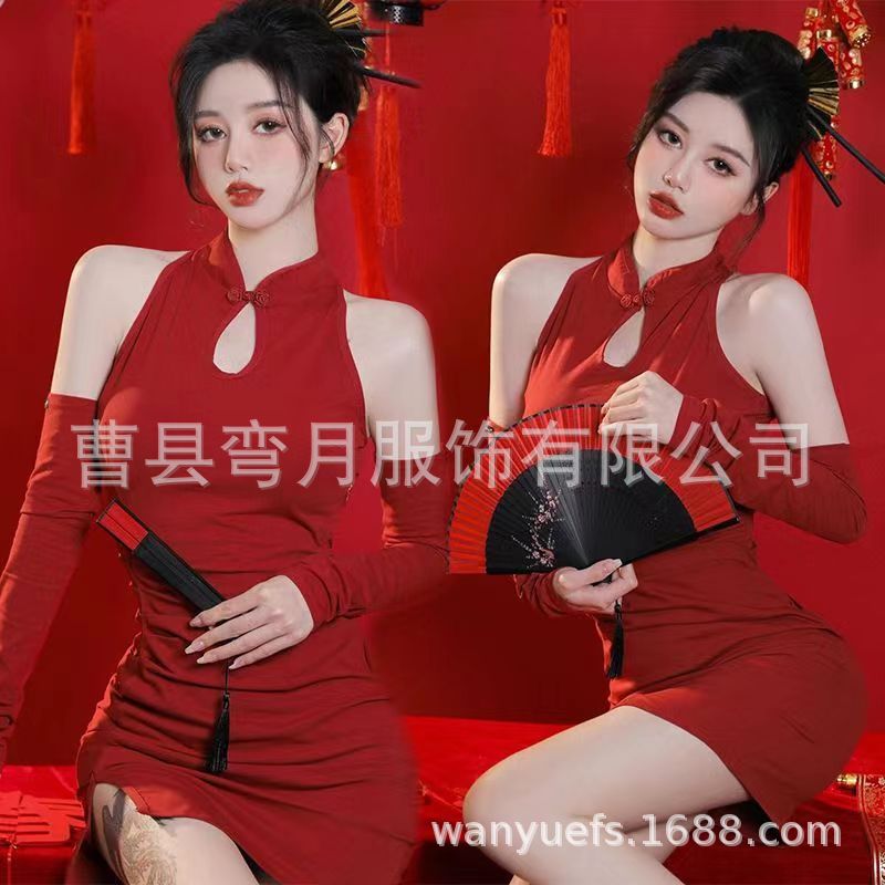 Pakaian foto Studio Tahun Baru, pakaian fotografi cheongsam China retro merah, pakaian foto gadis, performa seni, foto Studio