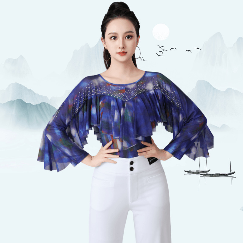 Gitba atasan dansa modern wanita, pakaian latihan dansa Latin, baju dansa standar nasional Waltz, kerut lengan panjang
