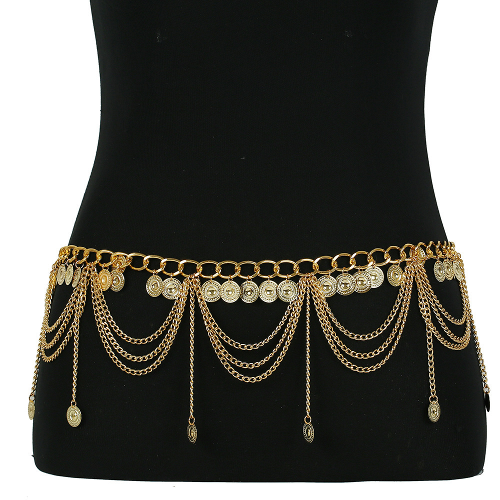 Sabuk Hanfu rantai pinggang koin rumbai perut wanita, aksesori pertunjukan tari perut Bohemian rantai emas