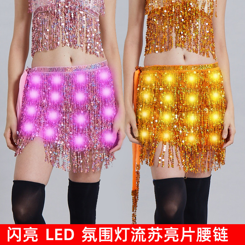 Handuk pinggul tari perut, handuk pinggul India rantai pinggang rumbai payet Simi LED kuning suasana pencahayaan panggung grosir