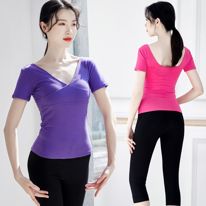 Kaus yoga leher V untuk wanita, pakaian latihan dansa wanita dewasa lengan pendek, kaus yoga leher V Klasik Latin modern