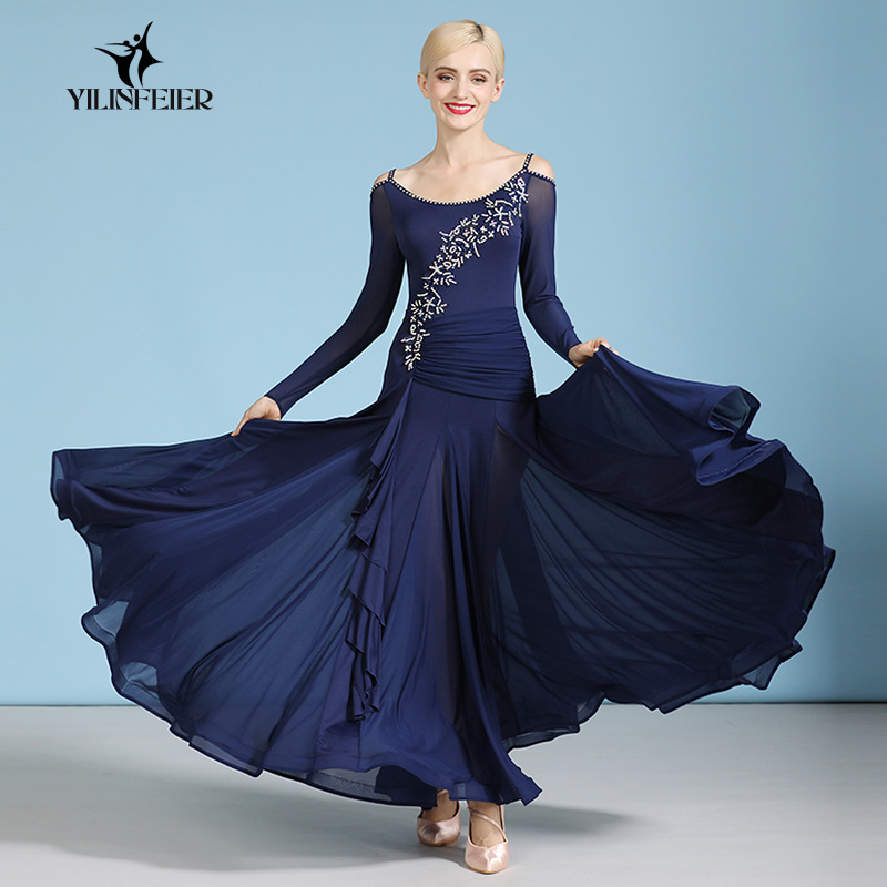 Meiyu gaun dansa modern dewasa baru MY875 Rok dansa standar nasional pakaian latihan Waltz lengan panjang biru tua