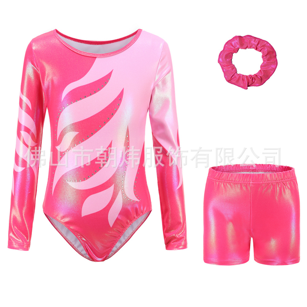 Pakaian Senam Anak Pakaian Tari Lengan Panjang Pakaian Pertunjukan Baju Ketat Baju Latihan Anak Perempuan Berlian Panas Celana Pendek Set Bunga Kepala