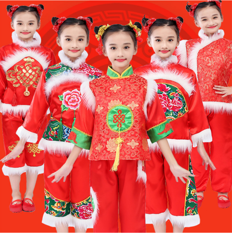 Hari baru Tahun Baru pakaian penampilan Yangko anak-anak anak-anak pembukaan meriah pakaian dansa merah setelan Tang pakaian etnis anak laki-laki dan perempuan