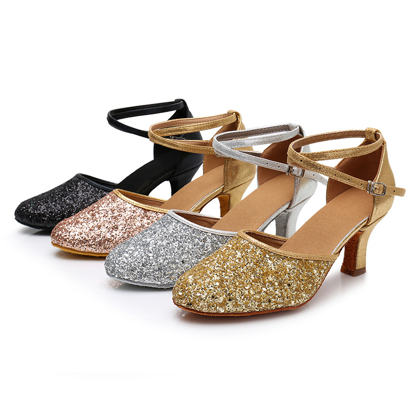Sepatu dansa Latin sol lembut wanita, sepatu dansa hak sedang dewasa, sepatu payet standar nasional wanita